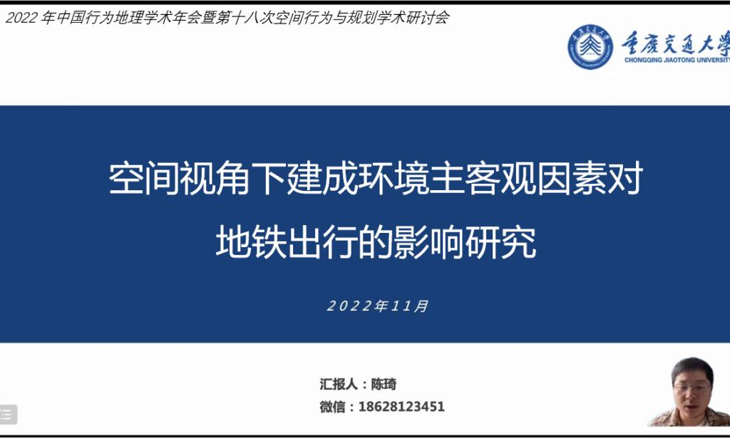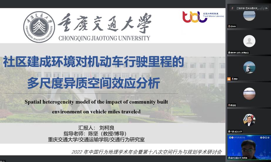我校交通行為研究團隊負責人陳堅教授、陳琦博士(建筑與城規(guī)學院)、博士研究生劉柯良(指導(dǎo)教師陳堅)及團隊18名碩士研究生參加了本次活動。陳堅教授在“時空間行為與疫情”分會場做了題為“新冠疫情及建成環(huán)境對公交客流量的影響模型”的報告,陳琦博士在“行為地理學理論與方法”分會場做了“空間視角下建成環(huán)境主客觀因素對地鐵出行的影響研究”的報告,博士研究生劉柯良在“時空間行為、交通與流動性”分會場做了“社區(qū)建成環(huán)境對機動車行駛里程的多尺度異質(zhì)空間效應(yīng)分析”的匯報。報告受到了與會專家的好評,提升了我校在該領(lǐng)域的研究影響。