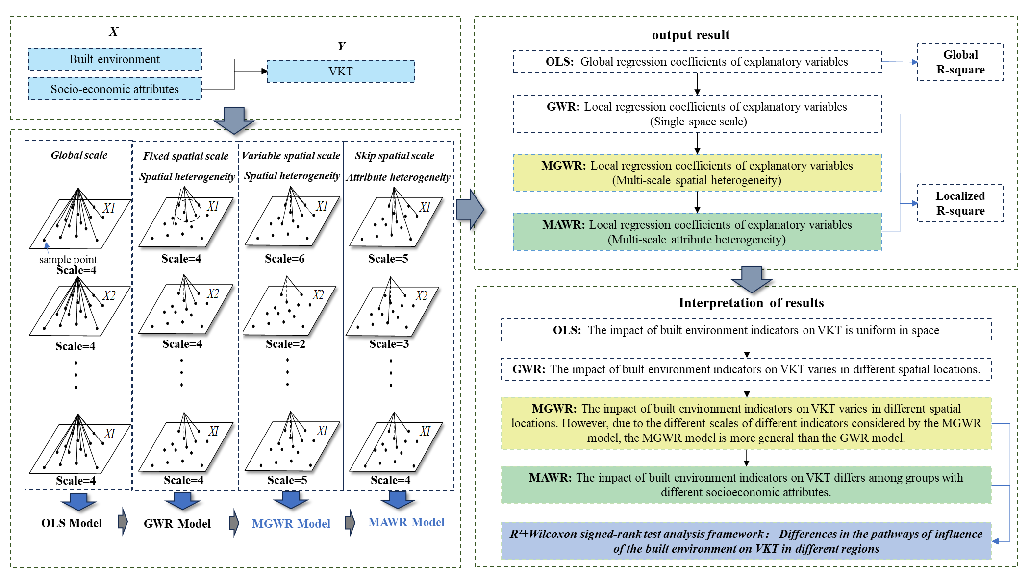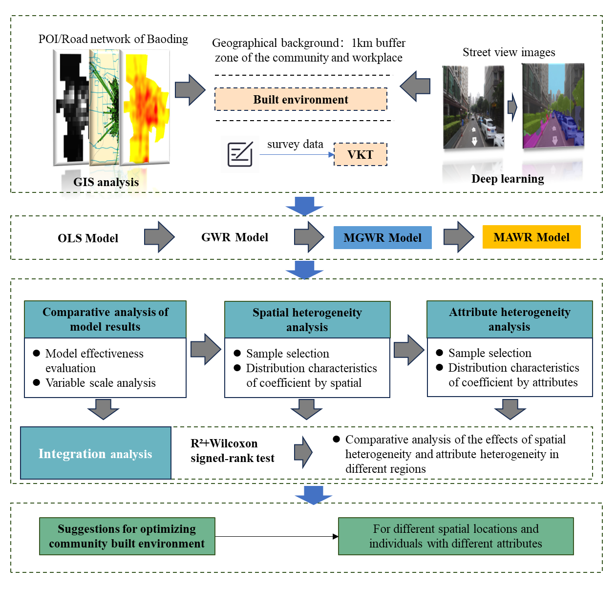在社區(qū)生活圈建設(shè)與“雙碳”背景下,為推動(dòng)綠色低碳出行、優(yōu)化社區(qū)出行環(huán)境,研究以河北保定市為案例,深入探討了社區(qū)建成環(huán)境對(duì)機(jī)動(dòng)車出行距離(VKT)的影響機(jī)理。在已有研究普遍單一空間異質(zhì)性問題的基礎(chǔ)上,本研究結(jié)合社會(huì)互動(dòng)、生命周期等理論,創(chuàng)新性的提出不同建成環(huán)境要素對(duì)VKT的影響存在空間和群體的“二元異質(zhì)性”,而忽視這一情況可能會(huì)導(dǎo)致社區(qū)綠色出行建成環(huán)境優(yōu)化策略效果不佳。為此,研究一方面引入了多尺度地理加權(quán)回歸模型(MGWR),以識(shí)別不同變量在空間上的異質(zhì)性影響特征,另一方面提出了多尺度屬性加權(quán)回歸模型(MAWR),從群體社會(huì)經(jīng)濟(jì)特征維度分析個(gè)體行為差異。最后,構(gòu)建了一個(gè)空間異質(zhì)性與群體異質(zhì)性的整合空間分析框架。研究發(fā)現(xiàn),不同建成環(huán)境因素對(duì)VKT的影響程度及作用范圍在空間與群體層面存在顯著差異,政策設(shè)計(jì)需要結(jié)合異質(zhì)性的具體表征進(jìn)行針對(duì)性設(shè)計(jì)。研究結(jié)果對(duì)推動(dòng)“以人為本”“綠色出行”的城市更新和精細(xì)化空間治理具有重要意義。