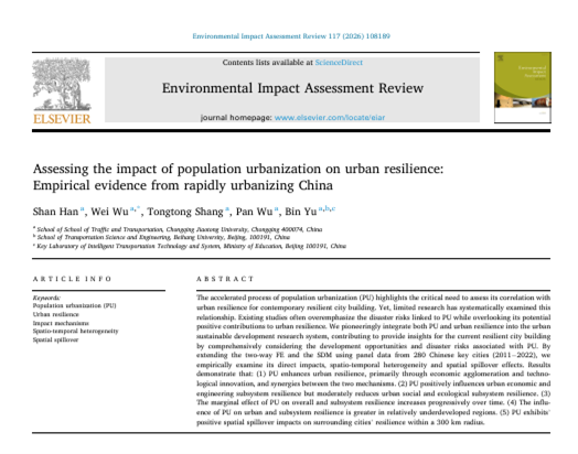 近日,交通運輸學院2024級在讀博士研究生韓珊在環(huán)境研究領域國際權威期刊《Environmental Impact Assessment Review》(中科院1區(qū)TOP期刊,影響因子:11.2)上發(fā)表題為“Assessing the impact of population urbanization on urban resilience: Empirical evidence from rapidly urbanizing China”的學術論文。