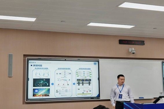 張振源副教授作題為《零信任自主無人集群可信感知與安全控制》的學(xué)術(shù)報(bào)告,圍繞復(fù)雜場景下無人系統(tǒng)的安全協(xié)同、可信感知與零信任體系構(gòu)建展開介紹,展示了團(tuán)隊(duì)在無人駕駛集群控制領(lǐng)域的理論突破與應(yīng)用探索,體現(xiàn)了學(xué)院在智能網(wǎng)聯(lián)系統(tǒng)安全方向的前沿創(chuàng)新能力。
