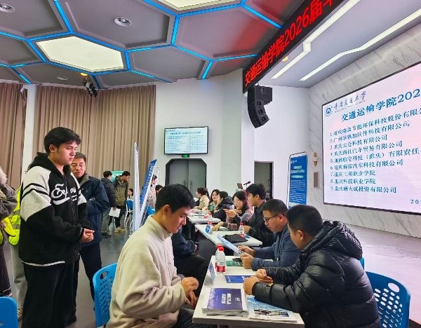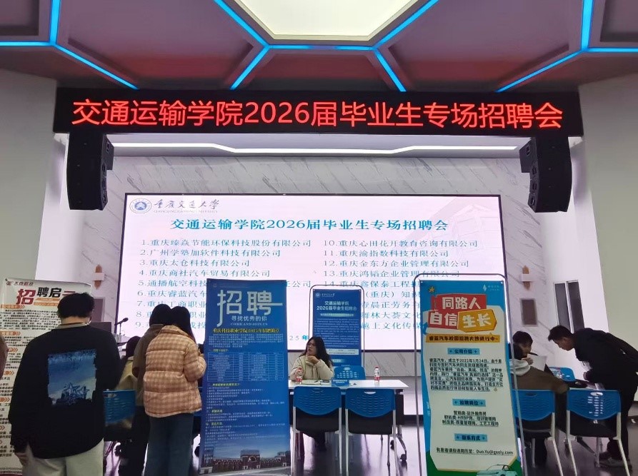 12月3日下午,交通運(yùn)輸學(xué)院2026屆畢業(yè)生專(zhuān)場(chǎng)招聘會(huì)在南岸校區(qū)第一教學(xué)樓大數(shù)據(jù)中心順利舉辦。本次專(zhuān)場(chǎng)招聘會(huì)匯聚了重慶臻焱節(jié)能環(huán)保科技股份有限公司和重慶睿藍(lán)汽車(chē)科技有限公司等18家企事業(yè)單位,涵蓋交通運(yùn)輸、交通工程、汽車(chē)服務(wù)和教育培訓(xùn)等多個(gè)行業(yè)。