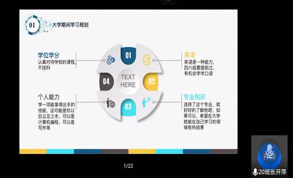 張開萍同志則向大一新生展示了自己的大學(xué)規(guī)劃,并提出心理健康和身體健康是一切的根本這一獨(dú)到看法,讓學(xué)弟學(xué)妹對(duì)學(xué)習(xí)生活有了新的認(rèn)知。學(xué)姐強(qiáng)調(diào),自由的前提是自律,要對(duì)自己高標(biāo)準(zhǔn)嚴(yán)要求。大一是打基礎(chǔ)的一年,要從學(xué)位學(xué)分、英語、專業(yè)知識(shí)、個(gè)人能力等方面著手,為自由全面發(fā)展夯實(shí)基礎(chǔ);在兼顧課程學(xué)習(xí)的同時(shí),還要利用空閑時(shí)間多閱讀、多實(shí)踐來提升綜合素質(zhì)。最后,她鼓勵(lì)同學(xué)們要開拓視野,綜合各方面因素謀劃未來人生與職業(yè)規(guī)劃,在不斷嘗試中找到適合自己的人生道路。