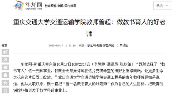 華龍網(wǎng)-新重慶客戶端10月17日10時(shí)23分訊(李婷婷通訊員 張秋笛)“既然選擇了‘教書育人’這一光輝事業(yè),我就會無怨無悔地在這片充滿希望的田野上繼續(xù)耕耘,讓更多生命之花在這片田野上綻放。”重慶交通大學(xué)交通運(yùn)輸學(xué)院交通工程系的青年教師曾超如是說道,他從入職以來,就一直把“當(dāng)一名教書育人的好老師”作為自己的人生目標(biāo),把教育的滿腔熱情迸發(fā)于教學(xué)科研事業(yè)上。