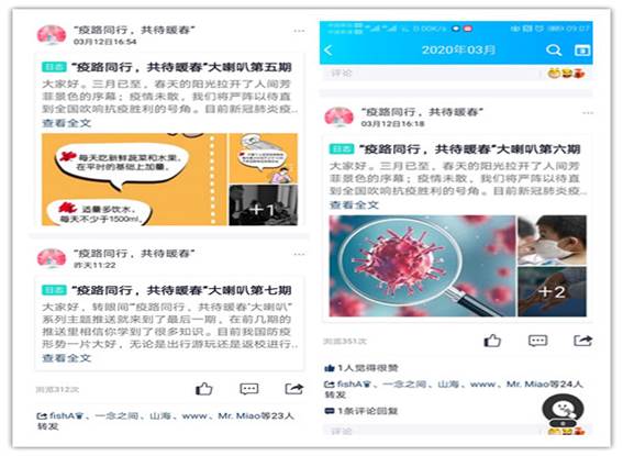 此次主題黨日活動將兩支部的學(xué)生黨員分為七組,每組學(xué)生合作完成一期防疫內(nèi)容并在每天早上發(fā)布在網(wǎng)上,其他黨員同志積極轉(zhuǎn)發(fā)。每期內(nèi)容包括辟謠、防控知識、英雄人物事跡三個板塊。