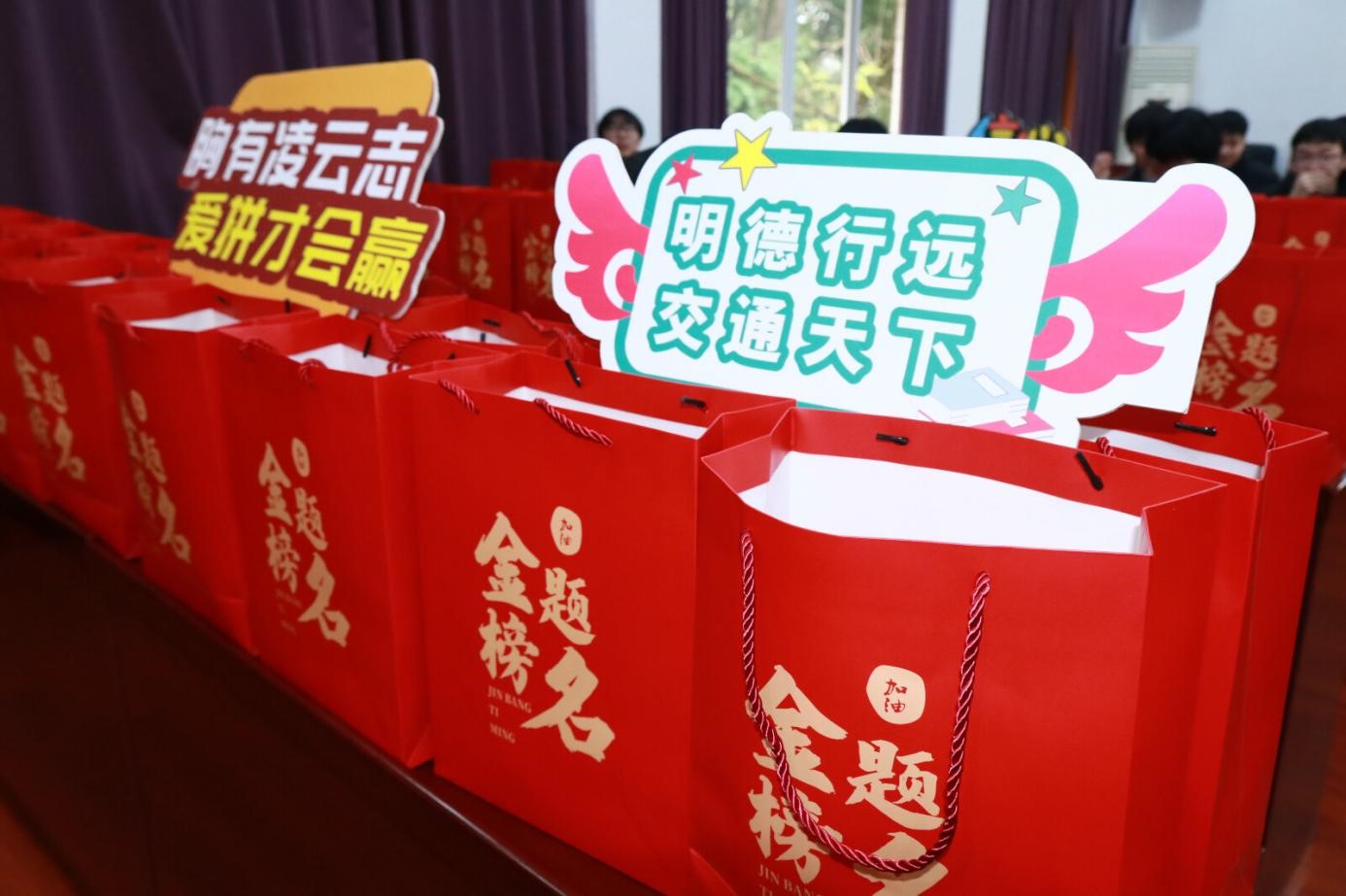 最后,學(xué)院領(lǐng)導(dǎo)和輔導(dǎo)員老師們?yōu)榭佳袑W(xué)子們送上精心準(zhǔn)備的“考研加油禮包”,承載著學(xué)院滿滿的祝福與期待,寓意著同學(xué)們能夠一“研”為定,成功上岸。