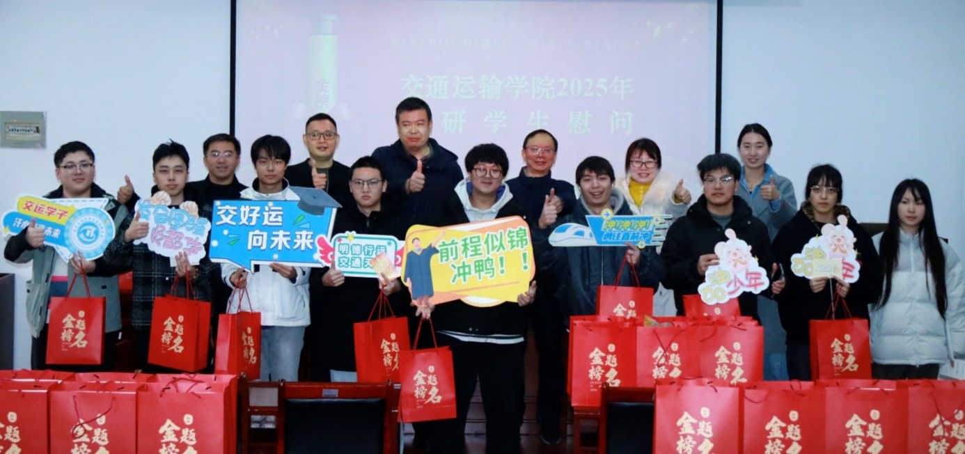 12月11日,在2026年全國(guó)碩士研究生招生考試來(lái)臨之際,為助力考研學(xué)子筑牢信心、勇毅前行,交通運(yùn)輸學(xué)院在學(xué)院301會(huì)議室組織考研慰問(wèn)活動(dòng)。學(xué)院黨委書(shū)記魏銅鈴、院長(zhǎng)劉唐志、黨委副書(shū)記張韓笑以及蔡志鵬、劉楠楠、王嵩、劉爽四位老師來(lái)到現(xiàn)場(chǎng)一起為考研學(xué)子發(fā)放慰問(wèn)禮包,并送上暖心關(guān)懷與真摯祝福。